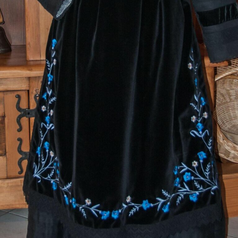 On aime le bleu éclatant des gentianes, mises en valeurs par le noir profond du velours. Le prix de ce châle est une réalisation avec pose d’une dentelle noire. Si vous voulez des franges, veuillez me contacter. Un bel atout pour retrouver l’authenticité des anciens châles.